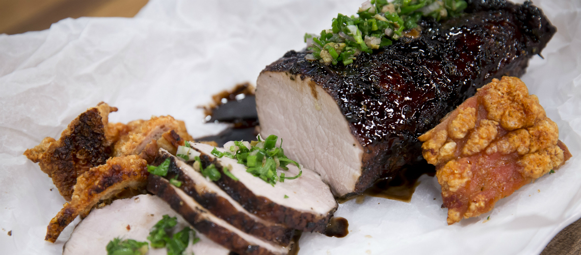 A karajt elválasztom a bőrétől, és jól körbefűszerezem az apróra vágott rozmaringgal, kakukkfűvel, sóval és borssal. A Bőrét sózom, majd zsíros felével lefelé elkezdem pirítani egy nagyobb serpenyőben amíg jól meg nem pirul, a zsír nagy részének ki kell olvadnia. Ugyanebben a serpenyőben, magas hőn körbepirítom a karajt, majd jól meglocsolom balzsamecettel és hagyom, hogy kicsit kiforrja magát, majd az egészet egy tálba helyezem, megdobálom 5db tört fokhagymával és a sütőbe helyezem. Egy rácsra fölé helyezem a bevagdosott bőrt és készre sütöm. Mikor kész, kiveszem és félreteszem pihentetni. Ez idő alatt szétválasztom a pecsenyelevet a zsírtól, utóbbit félrerakom a hűtőbe. A pecsenyelevet kicsit visszaforralom és a tűzről levéve pár vajkockával megdobálom, és homogénre keverem. Tálalhatunk!