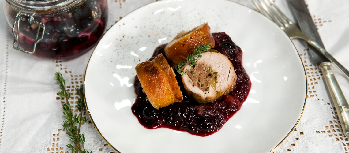 Kicsontozzuk a fácánt és szétterítjük. A levágott húsból, tojásból, tejszínből, kakukkfűből és ízlés szerint áfonyából prádot készítünk, feltekerjük, sütőben kisütjük.
