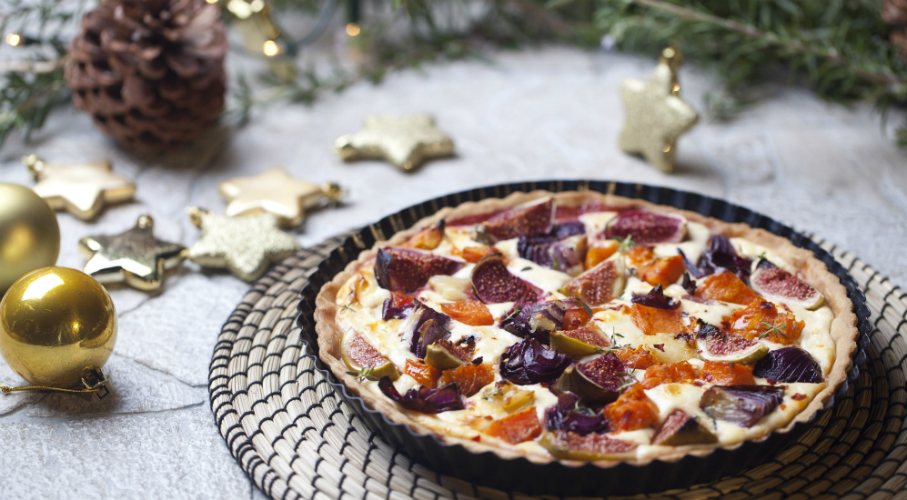 A tészta elkészítéséhez egy keverőtálba öntjük a lisztet, hozzáadjuk a hűtőhideg, darabokra vagdosott vajat és a sót. Robotgéppel az egészet addig keverjük, míg morzsalékos állagúvá válik. Ekkor beleütünk egy egész tojást, majd hozzáöntjük a kanálnyi jéghideg vizet, és az egészet gyors fokozaton homogén tésztává dolgozzuk össze. A tésztát pár gyors mozdulattal még kézzel összedolgozzuk. 30 percig pihentetjük a hűtőszekrényben, majd 3-4 mm vastagságúra nyújtjuk. A kinyújtott tésztát óvatosan feltekerjük a sodrófára, majd beleborítjuk a sütőpapírral kibélelt piteformába. Körbe mindenhol beleigazgatjuk a tésztát, a kilógó részeket levágjuk. Alaposan megszurkáljuk egy villával, majd sütőpapírral vagy alufóliával beborítjuk, és száraz borsót vagy babot töltünk rá nehezékként az elősütéshez. A sütőtököt 1 cm-es kockákra, a lilahagymát pedig négybe vágjuk, tepsibe tesszük, mellérakjuk héjastul az egészben hagyott fokhagymát és a kakukkfű-ágakat, meglocsoljuk olívaolajjal, sózzuk-borsozzuk és 190 fokos sütőben sütni kezdjük úgy, hogy mellé rakjuk a nehezékkel kibélelt tésztát is. A tésztát 15 perc alatt elősütjük, eltávolítjuk a nehezéket fóliástól, és az üres tésztát további 5 percig sütjük a forró sütőben. A zöldségekkel együtt kivesszük a sütőből, kicsit hűlni hagyjuk és közben elkészítjük a sajtos alapot: a kecskesajtot, a mascarponét és a tojássárgáját kevés feketeborssal alaposan kikeverjük. Ezt belekanalazzuk a tésztába, elrendezzük rajta az elősütött zöldségeket és a negyedelt fügéket. Egy kevés mézzel meglocsoljuk a fügeszeleteket és meghintjük a chilipehellyel. Az egészet visszatesszük a sütőbe újabb 15 percre, tálalás előtt pedig hagyjuk kicsit lehűlni, hogy szeletelhető legyen.