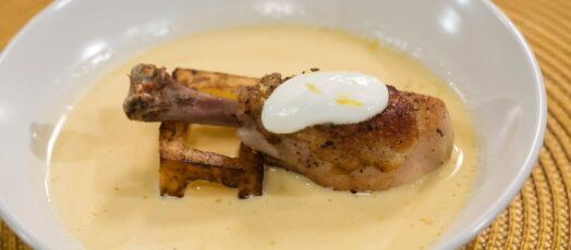 Becsinált krémleves, csirkebőr chipsszel