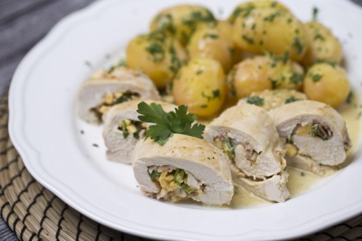 Csirkemelltekercs mustáros öntettel és főtt burgonyával