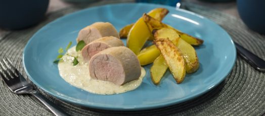 SERTÉS SZŰZ ROKFORTOS ÖNTETTEL, AMERIKAI BURGONYA