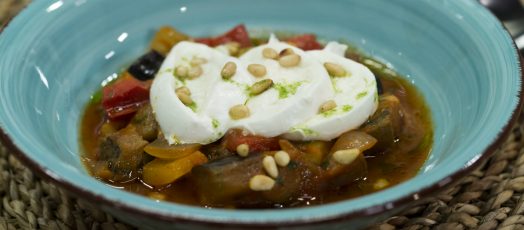 Caponata (szicíliai padlizsán saláta) fenyőmaggal, mozzarellával
