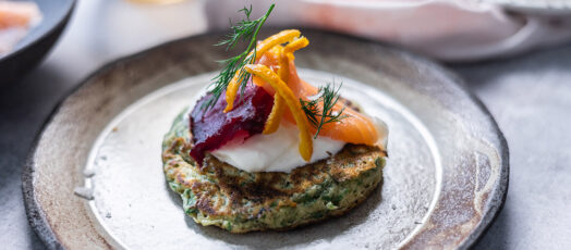 Sült cékla fűszeres palacsintán, füstölt lazaccal