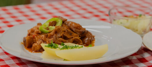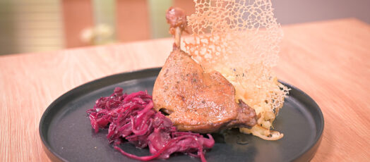 Kemencés kacsa comb, málnaecetes lilakáposzta, karamellizált hagymás törtburgonya