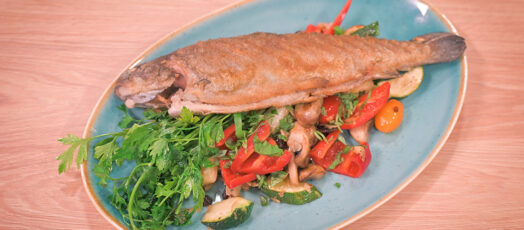Egészben sült pisztráng, mazsolás mandulás sült zöldségekkel