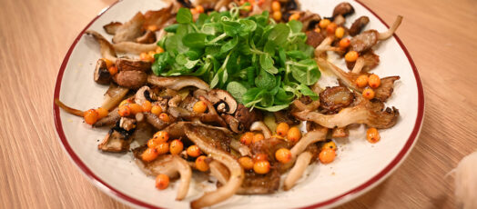 Grillezett gombasaláta mézes homoktövissel, Rukkola sült sütőtökkel, homoktövis dresszinggel