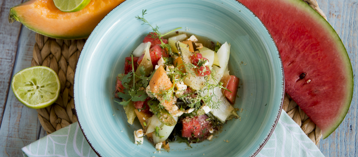 Tisztítsuk meg a spárgát, vágjuk darabokra a dinnyét, majd pácoljuk be yuzuval, olajjal, szójaszószsal, lime-mal és sushiecettel. A spárgát és a pak choyt megsütjük, hozzáadunk teriyakit és dinnyekockákat. Friss mentával és korianderrel tálaljuk.