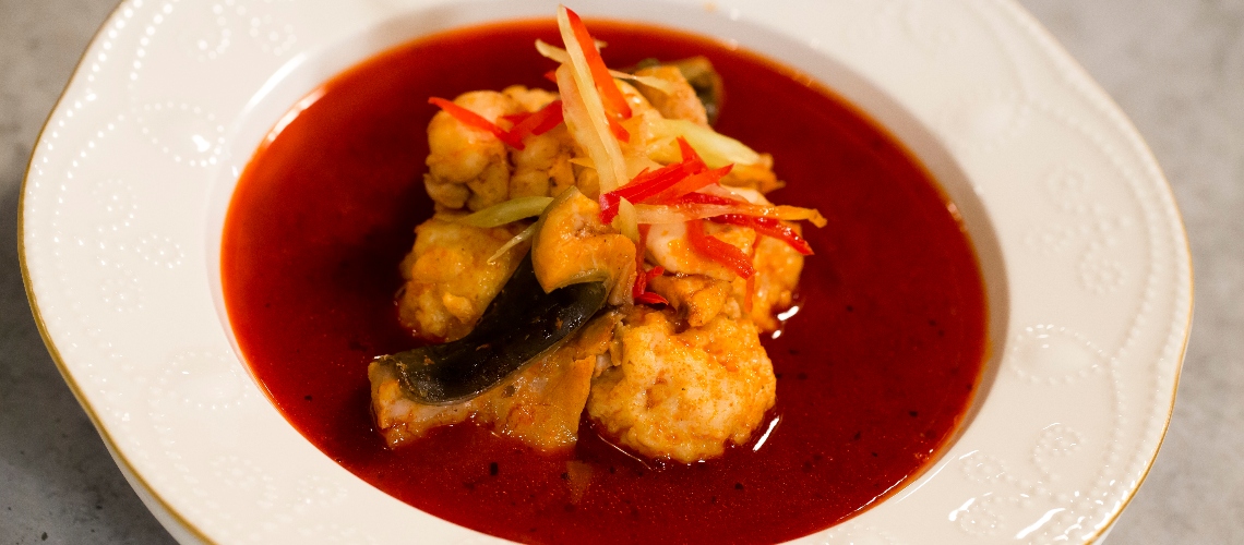 Az így nyert levet ismét felforraljuk, majd sóval és pirospaprikával ízesítjük. 15-20 percig rotyogtatjuk, utána hozzáadjuk a formázott kis halgombócokat, és néhány perc alatt puhára főzzük.