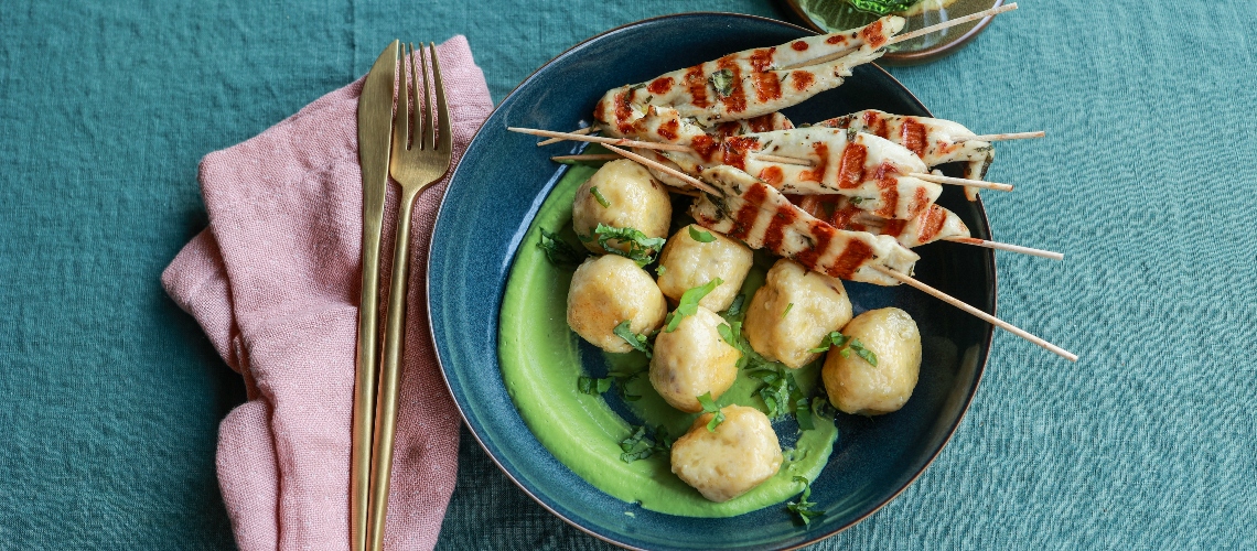A bepácolt csirkemellett csíkokra vágjuk, pálcikára húzzuk és grillsütőben kisütjük. A gombocokat a szósszal és a csirkenyársakkal tálaljuk.
