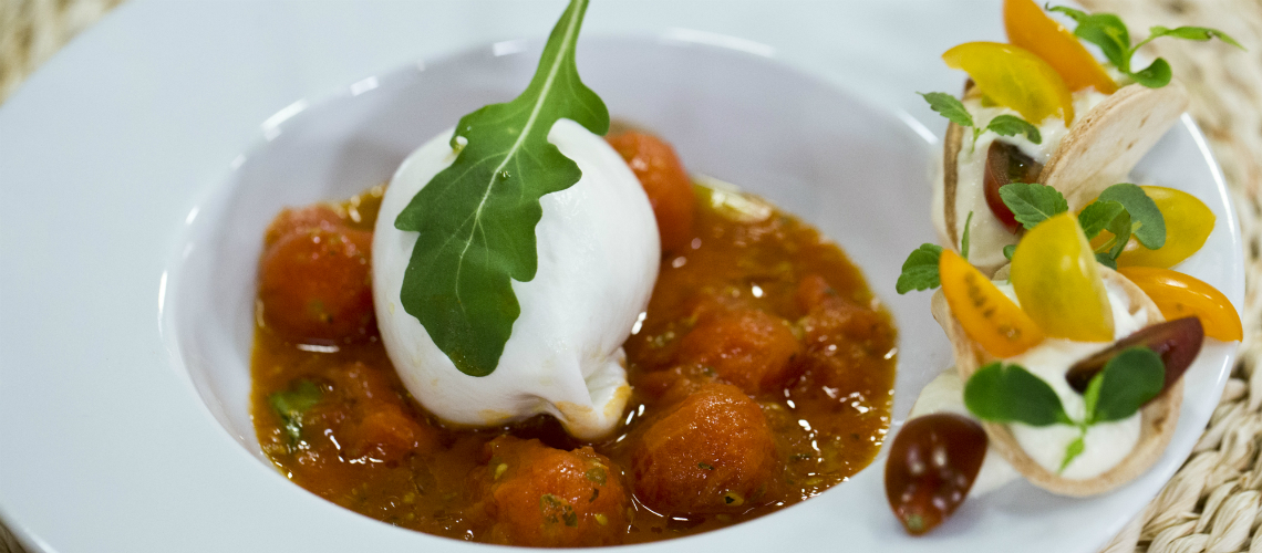 A cherry paradicsomok héján apró metszést ejtünk, rövid párolás után leszedjük a héját. Paradicsomszószt készítünk: a paradicsomot rövid ideig kevés olajon, fokhagymával és bazsalikommal pároljuk, majd kiszedjük a fokhagymát és a bazsalikomot. Amikor a szósz kihűlt, botmixerrel pürésítjük. A parmezánkrémhez 90 fokra hevítjük a tejszínt és hozzáadjuk a parmezént. Jól elkeverjük, szűrőn keresztül passzírozzuk, és hagyjuk kíhűlni. Tálaláskor előbb a paradicsomszószt tesszük a tányérra, majd erre kerül a burrata. Parmezánkrémmel és cikkekre vágott koktélparadicsommal díszítjük.