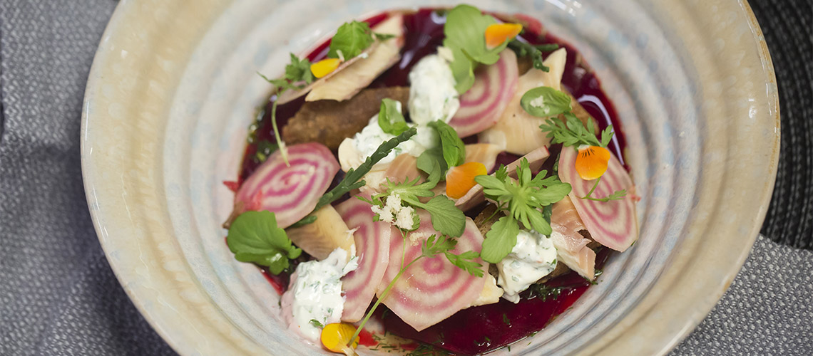 A salottát félfőre vágjuk, ecetes vízben blansírozzuk, sóval, citrommal és borssal ízesítjük. A tejfölt sóval, citrommal és borssal ízesítjük. A céklát felszeljük és bepácoljuk. Vágjuk a halat vékony szeletekre, helyezze rá a pácolt céklát, a fűszernövényeket, a salottát és a pirított bagett darabokat. Reszelt tormával ízesítjük.