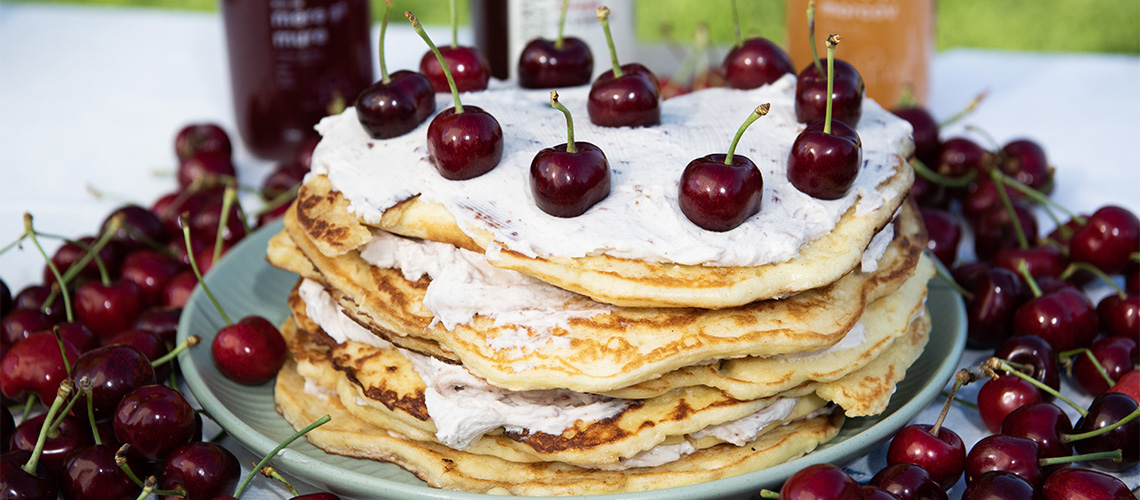 Folytatjuk palacsinta, krém, lekvár és cseresznye váltogatásával.
