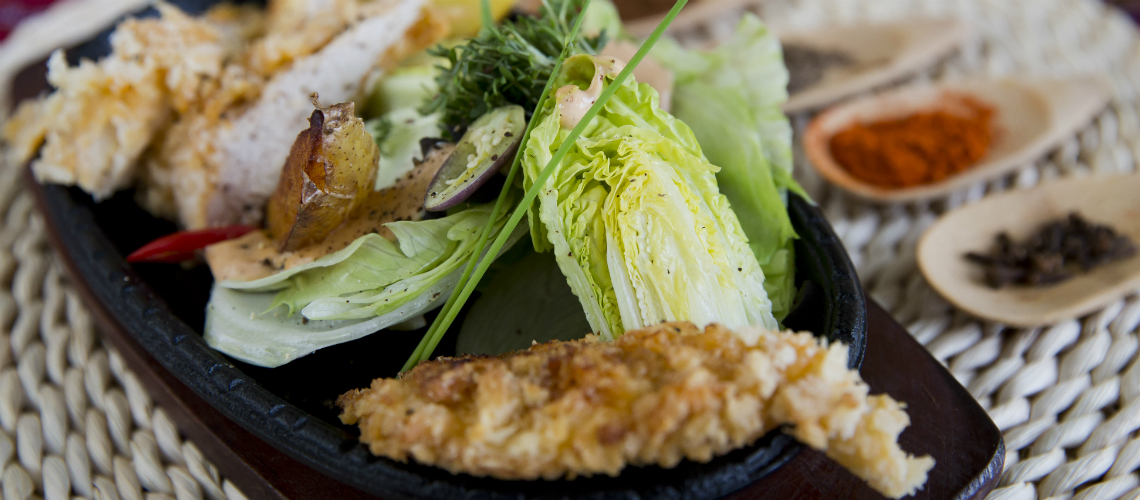 Főzzük meg a burgonyát a héjában, és hagyjuk kihűlni. Tisztítsuk meg a csirkemellet, megütögetjük, majd petrezselyemzöldes joghurtban marináljuk. Megsózzuk, bepanírozzuk, kacsazsírban megpirítjuk, majd a sütőben készre sütjük. Salátával, krumplival, chilivel harisszával tálaljuk.