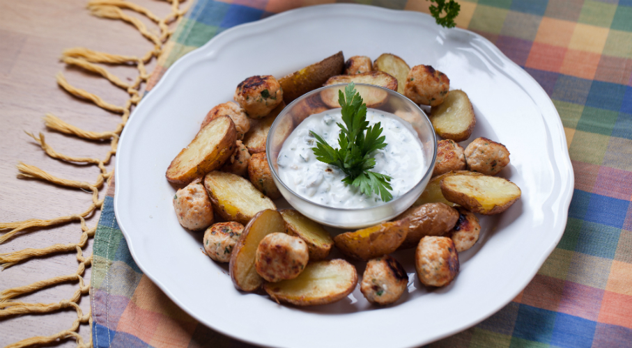 A csirkehúst kockára vágjuk és a robotgépbe tesszük. Hozzáadjuk a tejfölt, fokhagymát és sót. Összeaprítjuk. Közben apróra vágjuk a petrezselymet és a húsos keverékhez adjuk. Nedves kézzel hengereket formázunk a nyársakra. Olajban, vagy a sütőben 12 perc alatt megsütjük. A burgonyát megmossuk és leszárítjuk. Negyedekre vágjuk, és ollívaolajjal meglocsoljuk. Megsózzuk. 200 fokon kb. 25 percig sütjük. A mártás hozzávalóit apróra vágjuk és tejfölell összekeverjük. Külön tálaljuk.