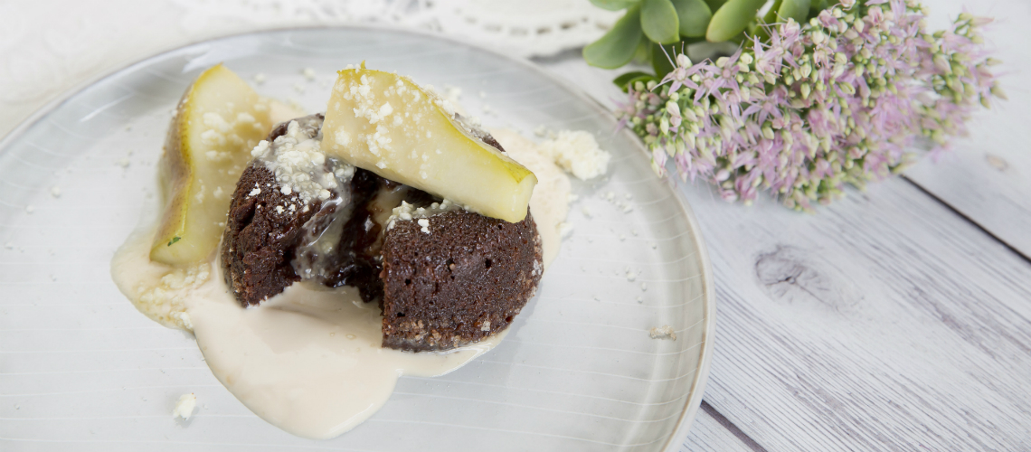 A vajból, a csokoládéból, a lisztből, a kakaóból, a mandulából és a cukorból tésztát készítünk, amelyet formákba öntünk. Mindegyik szuflé közepébe nyomjunk egy darab kecskesajtot.