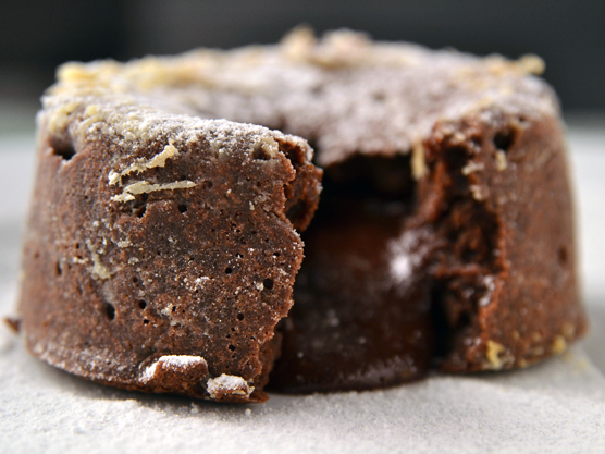 20 dekagramm jó minőségű darabolt étcsokoládét 16 deka vajjal vízfürdő felett felolvasztunk. 3 darab egész tojást 3 darab tojássárgájával és 12 dekagramm kristálycukorral habosra keverünk. Hozzáadunk 6 és fél dekagramm lisztet és az egészet egybekeverjük az olvasztott csokoládéval és vajjal. Vajazott és lisztezett formában 200 fokos sütőben 6-8 percig sütjük. Vaníliafagylalttal és friss mentával tálalhatjuk.