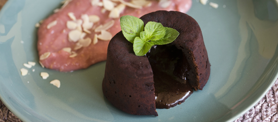 A tésztához a vajat és a csokoládét vízgőz felett összeolvasztjuk. A masszába belekeverjük a kakaót, a cukrot, a tojást, a tojássárgáját és habverővel felverjük, végül hozzákeverjük a tönkölylisztet is. A kész keveréket a vajjal kikent, és kakaóval megszórt kerámia formákba öntjük, kb. 1 cm-t kihagyva a forma szélétől . Előmelegített sütőben sütjük 7-8 percig, 185 fokon. Amikor már a tészta széle kemény és a közepe enyhén beesik, kivesszük a sütőből.