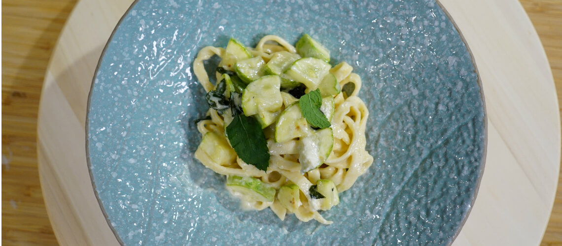 A házilag készített pastát cukkini, menta és kecskesajt házasításából megálmodott szószba öltöztetjük. Ez a mennyei kompozíció bárki kíváncsiságát felkeltheti.