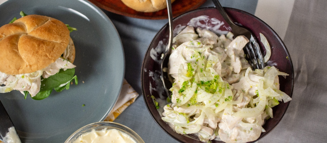 Egy keverőtálban összekeverjük a majonézt, a joghurtot, a citrom reszelt héjár és frissen facsart levét, valamint az édeskömény zöldjét. Beleforgatjuk a csirkét és az édesköményt. Önmagában salátaként vagy császárzsemlébe töltve fogyasztjuk.