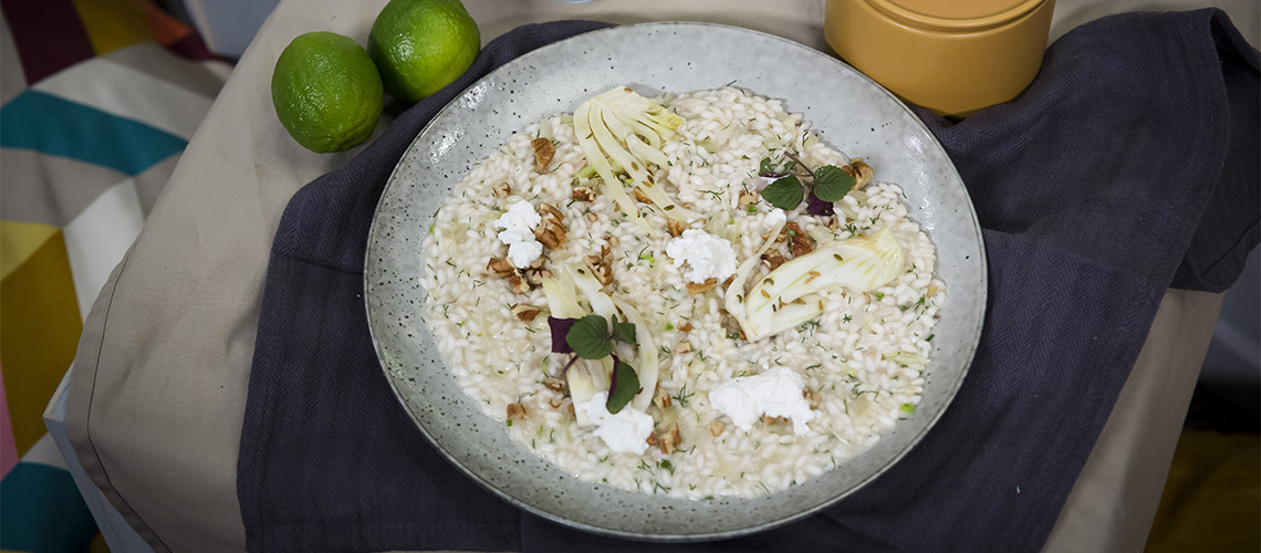 Az édesköménymagot szárazon pirítani kezdjük, közben az édesköményt vékony szeletekre vágjuk és egy lábosban pácoljuk. Belekeverjük az édesköménymagot, majd egy kevés lime levet csöpögtetünk bele. Ecettel locsoljuk, kevés cukrot adunk hozzá, és redukáljuk. . Ha kész a rizottó, hozzáadjuk a pácolt édesköményt és ráöntjük a maradék alaplét. Hozzáadjuk az apróra vágott kaprot és vajat, utána parmezánt reszelünk rá. Összekeverjük, majd friss kapros édesköménnyel és ricottával tálaljuk.