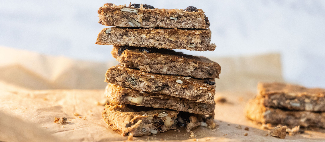 10 dkg zabpelyhet finomra darálunk egy turmixgépben. Hozzáadjuk a pirított magvak felét, ezeket is finomra daráljuk, majd hozzáadjuk a másik adagot is, de ezeket már csak durvára aprítjuk. Az egészet átöntjük egy nagy keverőtálba. Összekeverjük a maradék zabpehellyel és az aszalt gyümölcsökkel, amiket egyforma, kb. mazsola nagyságú darabokra aprítunk előtte. Végül hozzáadjuk a tökmagot, a rizslisztet, és a sót is.