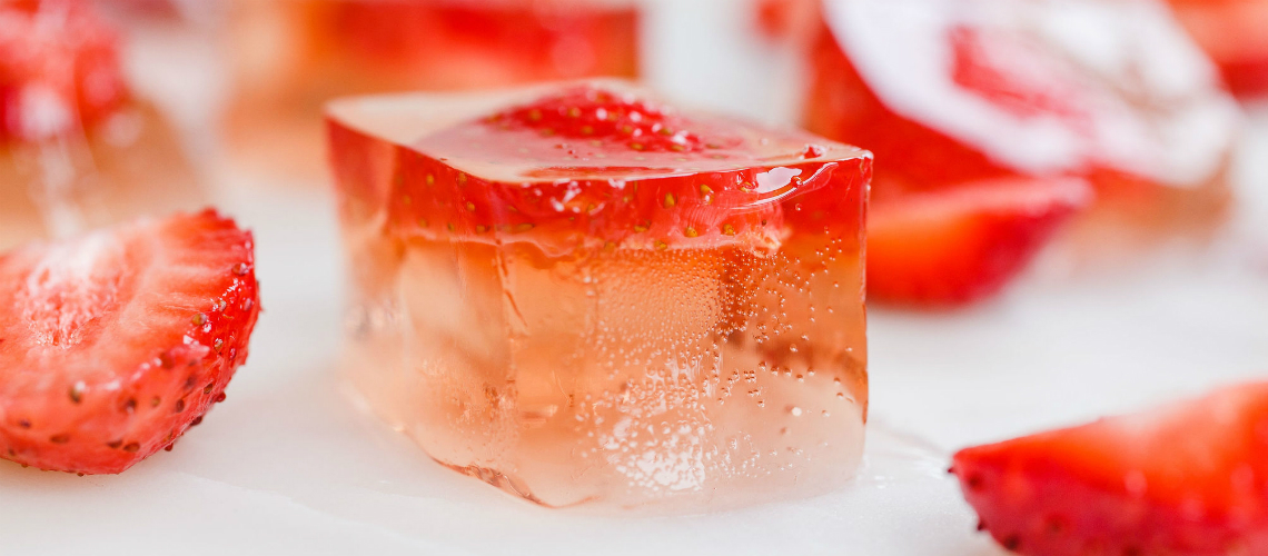 2 dl pezsgőt felforralunk a cukorral, ha feloldódott, lehúzzuk a tűzről, hozzáadjuk a maradék pezsgőt és a vodkát. Elkeverjük, majd beletesszük a zselatinlapokat es addig kevergetjük, amíg azok is feloldódnak. Egy lapos edénybe vagy jégkockatartóba kettévágott epreket teszünk, és erre öntjük óvatosan a zselét. Hűtőben legalább 8 órát dermesztjük.