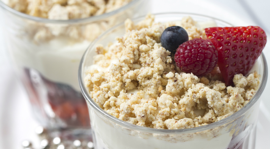 Villával vagy kézzel morzsás állagúra dolgozzuk a tejport, mandulalisztet, kukoricakeményítőt, sót, cukrot és a feldarabolt vajat. A morzsát szétterítjük egy sütőpapírral bélelt tepsin és 120 fokra előmelegített sütőben 20 percig ropogósra sütjük. Egy tálban összeforgatjuk a morzsát és a vízgőz felett felolvasztott fehércsokit, majd az egészet hagyjuk kihűlni. Hűtőszekrényben 1 hétig légmentesen elzárva tárolhatjuk.