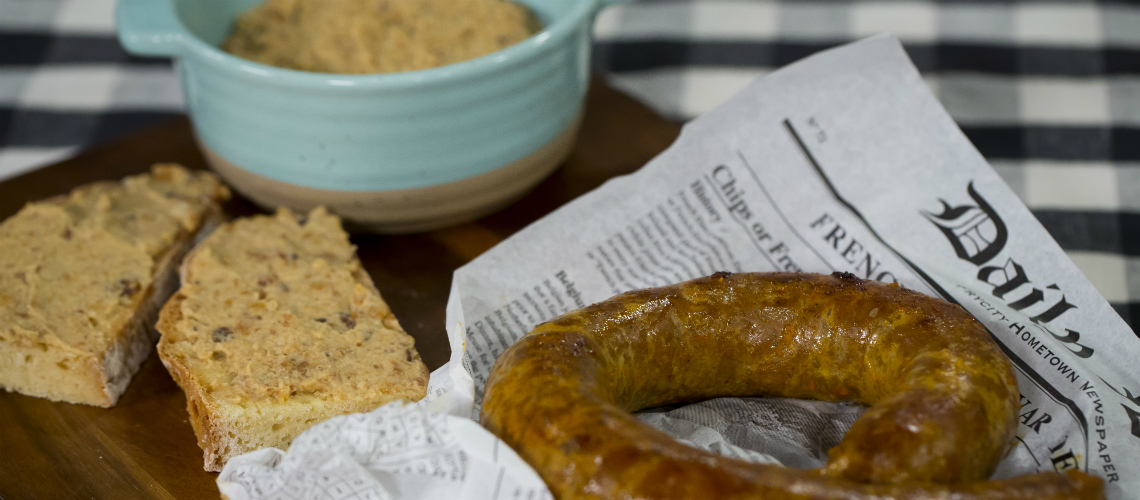 A kolbászhoz valókat (a fűszerek kivételével) aprítógéppel szinte pépesre darálom, majd sózom és fűszerezem. Alaposan összedolgozom, a beáztatott bélbe töltöm és 170 fokos sütőben pirosra sütöm.