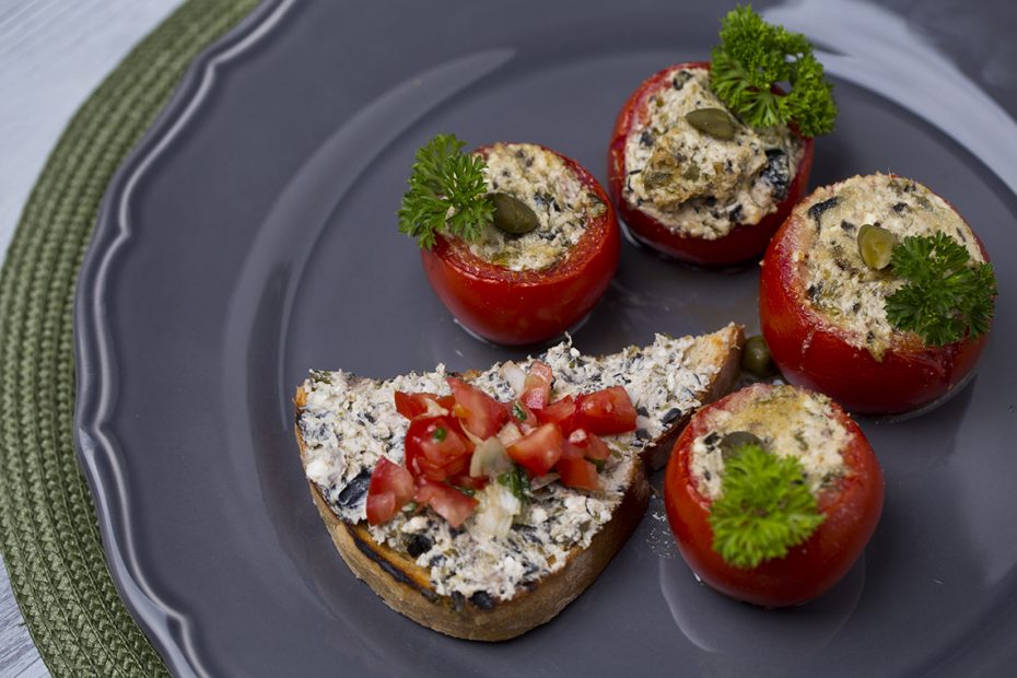 A paradicsomok húsát egy kanállal kivájjuk. Aprítógépbe belekockázzuk a fetasajtot, hozzáadjuk az olívabogyót, a szardellát és a kapribogyót. Alaposan összedolgozzuk, és a masszával megtöltjük a paradicsomokat. Ezután megszórjuk zsemlemorzsával a tetejüket, és 15 percre a sütőbe tesszük.