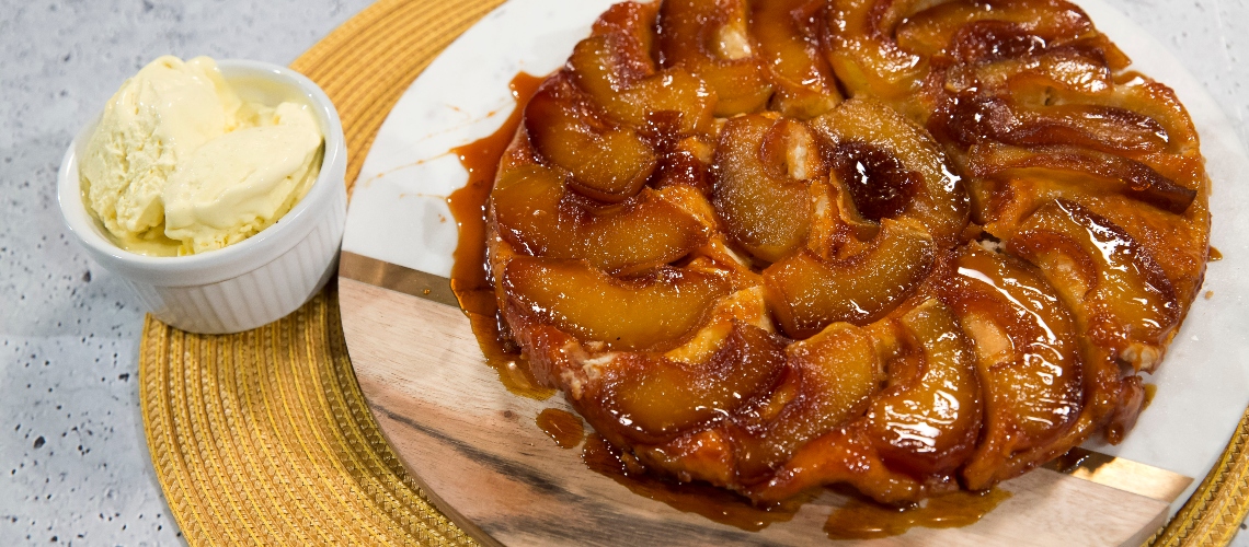 Egy tortaformába beszorítunk sütőpapírt beleöntjük a karamellt. Erre tesszük az előpárolt almacikkeket.