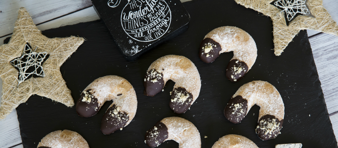 Kis kifliket formázunk a tésztából, 180 fokos sütőben megsütjük. Ha kihűlt csokiba mártjuk a két szélét és pirított darabolt mandulával megszórjuk.
