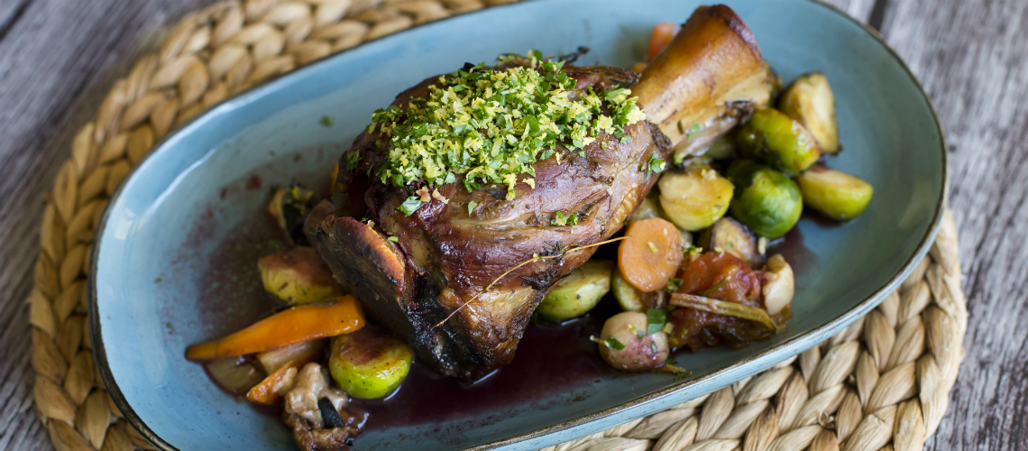 Petrezselyemzöldből és a citromhéjból készült mixet a leitatott húsra szórjuk. Mézes kelbimbóval és karamellizált citrommal tálaljuk.