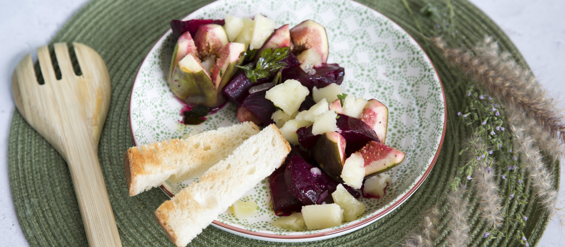 Fűszerezzük a céklát sóval, borssal, csomagoljuk fóliába és kb. 40 percig süssük! Sütés után meghámozzuk, nagyobb darabokra vágjuk, olívaolajjal ízesítjük. Ecettel és apróra vágott petrezselyemmel összekeverjük. Vágjuk föl a fügét, karamellizáljuk a serpenyőben, öntsünk alá vodkát és flambírozzuk! Tálaljuk sült céklával és reszeljünk rá pecorino sajtot.