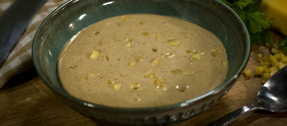 1 fej szeletelt vöröshagymát és burgonyát kevés vaj és olaj keverékén megpirítunk. Hozzáadjuk a gombát, sózzuk. Borssal, friss kakukkfűvel fűszerezzük. Felöntjük zöldégalaplével és vízzel, majd puhára főzzük. Leturmixoljuk és tejszínnel dúsítjuk.
