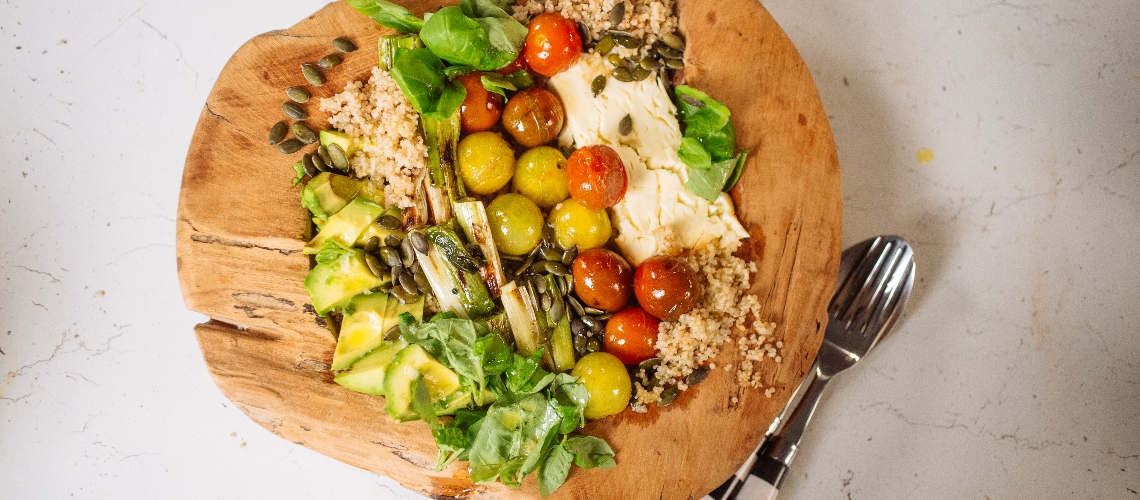 Az avokádókat feldaraboljuk. A quinoát egy salátás tálba tesszük, ráhalmozzuk az avokádót, a grillezett zöldségeket és a sült feta sajtot, majd meglocsoljuk az öntettel.