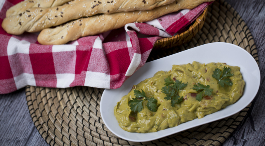 Egy serpenyőben megpirítjuk a hagymát a fokhagymával, hozzáadjuk a paradicsomot és egy kissé megsütjük. Hagyjuk kihűlni. Ezután összeturmixoljuk az avokádót az olajjal és összekeverjük a serpenyőben megpirított keverékkel. A keveréket ízesítjük sóval, borssal, a zöldcitrom levével és a friss korianderrel. A grissinihez az élesztőt elkeverjük a vízben a mézzel. A felfuttatott élesztőt a tálban lévő lisztre öntjük. Hozzáadjuk az olajat, a vajat, a sót és borsot. A tésztát alaposan kidolgozzuk, majd kiborítjuk egy belisztezett deszkára. Kisebb darabokra osztjuk, amikből megformázzuk a grissiniket. Bekenjük egy kis olívaolajjal, megszórjuk a magokkal. Ezután a 170 fokra előmelegített sütőbe tesszük 15-20 percre.