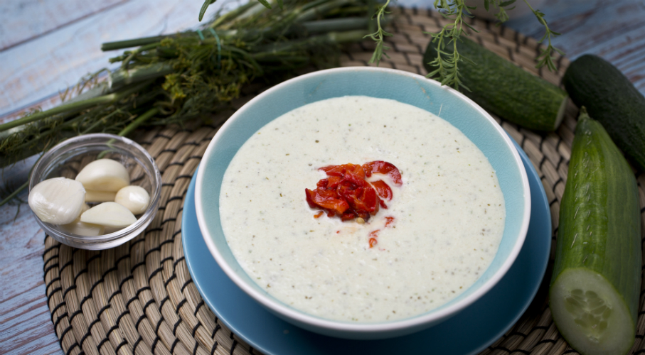 Az uborkákat, az újhagymát, a fokhagymát kevés tejföllel és alaplével alaposan leturmixoljuk. Borsozzuk, majd sóval és ecettel ízesítjük. Hozzákeverjük a maradék tejfölt és tejszínt és a sütőben sült, hámozott, csíkokra vágott paprikával tálaljuk.