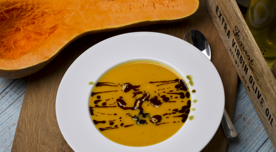 A tofuk kisebb kockákra vágjuk és egy kevéske olajjal ropogósra pirítjuk a serpenyőben. A Hokkaido tököt két darabra vágjuk, eltávolítjuk a magokat, és kisebb darabokra vágjuk. Egy forró edénybe olajat öntünk, megpirítjuk rajta a hagymát és fokhagymát. Hozzáadjuk a tököt, a sárgarépát, a kurkumát, a sót és borsot. Alaposan megpároljuk, majd felöntjük az alaplével. Amikor a tök megpuhult, sima krémmé turmixoljuk. Sóval és zöldfűszerekkel ízesítjük.