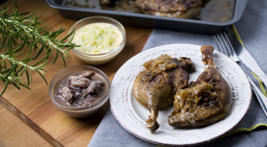 A kacsacombokat kissé bevagdaljuk, sózzuk, borsozzuk, és egy serpenyőben elősütjük. Áttesszük egy tepsibe, mellé rakunk egy fej szeletelt vöröshagymát, a vajat, hozzáöntjük a húsalaplevet, majd letakarva 180 fokos sütőben kb. 1,5 óra alatt puhára sütjük. A visszamaradt zsiradékban az apró kockára vágott szalonnát alaposan lepirítjuk. Hozzáadjuk a finomra vágott vöröshagymát, felöntjük kevés vörösborral, ízesítjük sóval, mustárral és hozzáadjuk az erdei gombát. Borsozzuk és összepároljuk. Az uborkamártáshoz a hámozott, magozott uborkát apró kockára vágjuk, majd forrásban lévő vízben leforrázzuk. Kivesszük, lehűtjük. A tojássárgáját elkeverjük a tejszínnel, sózzuk, borsozzuk. Hozzáadjuk az uborkát és kevés, forró pecsenyelével összeforgatjuk. Ízesíthetjük citromlével. Tálaláskor főtt burgonyát vagy akár burgonyagombócot is adhatunk mellé.