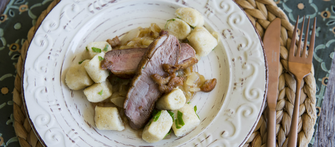 A burgonyát meghámozzuk, finomra reszeljük, összekeverjük apróra vágott petrezselyemmel, tojással és liszttel. Nudlikat formázunk, sós vízben kifőzzük, majd kacsazsíron glasszírozzuk. A kacsamellet bőrén megpirítjuk, majd sütőben pár perc alatt rozére sütjük.