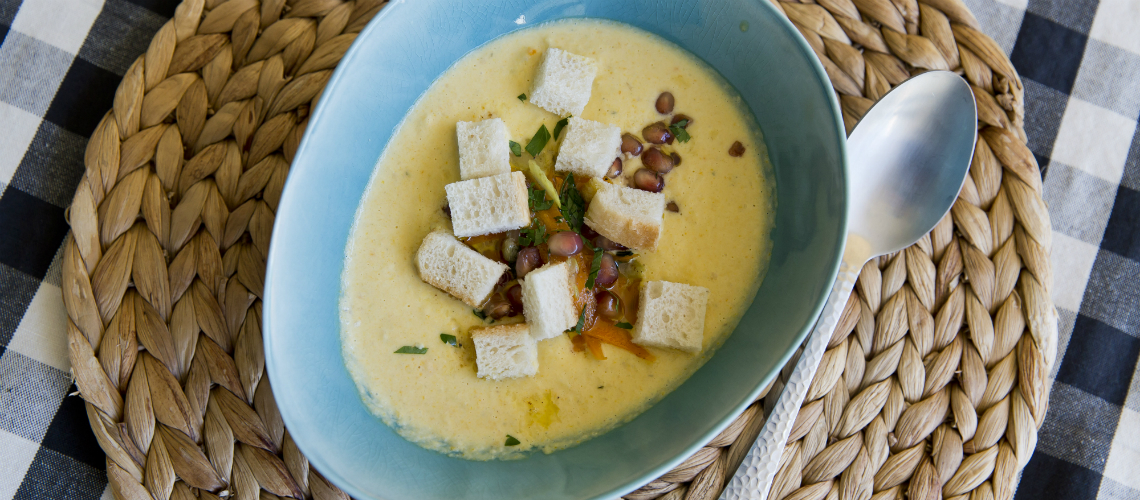 tMegpirítjuk, alaplével felöntjük, puhára főzzük a karfiolt. Turmixoljuk, Tejszínnel bekeverjük, fűszerezzük.