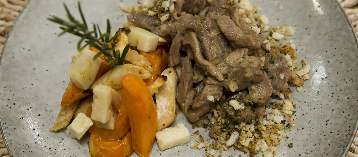 A csíkozott kecskecombot zsírjára pirított szalonnán, szeletelt hagymával együtt, folyadékkal szakaszosan felöntve, puhára pároljuk, majd 180 fokos sütőben 5 percig kihúzatjuk. A gyökérzöldségeket és az édesburgonyát nagyobb, rusztikus darabokra vágjuk, majd sóval, borssal, friss rozmaringgal, olívaolajjal sütőben megsütjük. A zsemlét apró kockákra vágjuk, vajjal ropogósra pirítjuk és reszelt citromhéjjal, vágott petrezselyemmel, zúzott fokhagymával keverjük össze. Tálaláskor ezt halmozzuk a hús tetejére, mellé adva a sült zöldségeket. Lehetőség szerint fűszeres kecskesajt kockákkal tálaljuk.