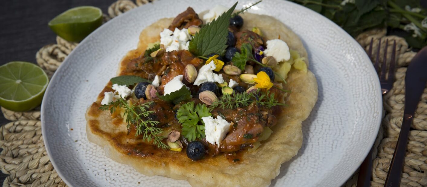 A burgonyát meghámozzuk és puhára főzzük. Hozzáadjuk az élesztőt a liszthez és a vízhez, és meggyúrjuk. Ha megkelt, megformázzuk, és kacsazsírban kisütjük. Az áfonyát kevés ecettel, cukorral és lime-mal bepácoljuk. Ha a bárány puha, kis darabokra szaggatjuk, zatart és apróra vágott metélőhagymát adunk hozzá. A húst a lángossal együtt tálaljuk, hagymát és szaftot adunk hozzá. Pácolt áfonyát, tajine fűszert, pisztáciát, zöldfűszereket és a juhtúró darabokat tálalunk hozzá.