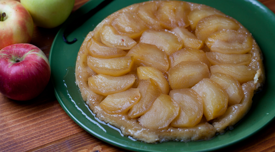 A tésztához a lisztet összedolgozzuk a vajjal, cukorral, sóval és éppen csak annyi hideg vizet adunk hozzá, amitől összeáll, de nem lesz ragacsos. Behűtjük, amíg elkészítjük a karamelles almát. Az almákat meghámozzuk, magházukat kivágjuk és a gyümölcsöket negyedeljük. Egy serpenyőben, amit később a sütőbe is be tudunk tenni, felolvasztjuk a vajat, hozzáadjuk a cukrot és alacsony lángon karamellizáljuk. Amikor elkezd bugyborékolni, hozzáadjuk a meghámozott, negyedelt almát. Az almákat félpuhára pároljuk a karamellben, majd az egészet lehúzzuk a tűzről. A tésztát lisztezett deszkán kinyújtjuk akkorára, hogy a serpenyőt éppen befedje. Ráterítjük az almás karamellre, a tészta széleit villával lenyomkodjuk, a közepét megszurkáljuk és 190 fokon 20-25 perc alatt készre sütjük. A sütőből kivéve 15 percig hagyjuk hűlni, majd egy gyors mozdulattal kifordítjuk egy tortatálra. Ha az almák a serpenyőben ragadnak, kiszedjük és elrendezzük őket a süti tetején, senki sem fogja észrevenni a turpisságot. A serpenyőből a karamellt a süti tetejére csorgatjuk, ha magától nem teszi ezt meg. Vaníliafagyival tálaljuk.