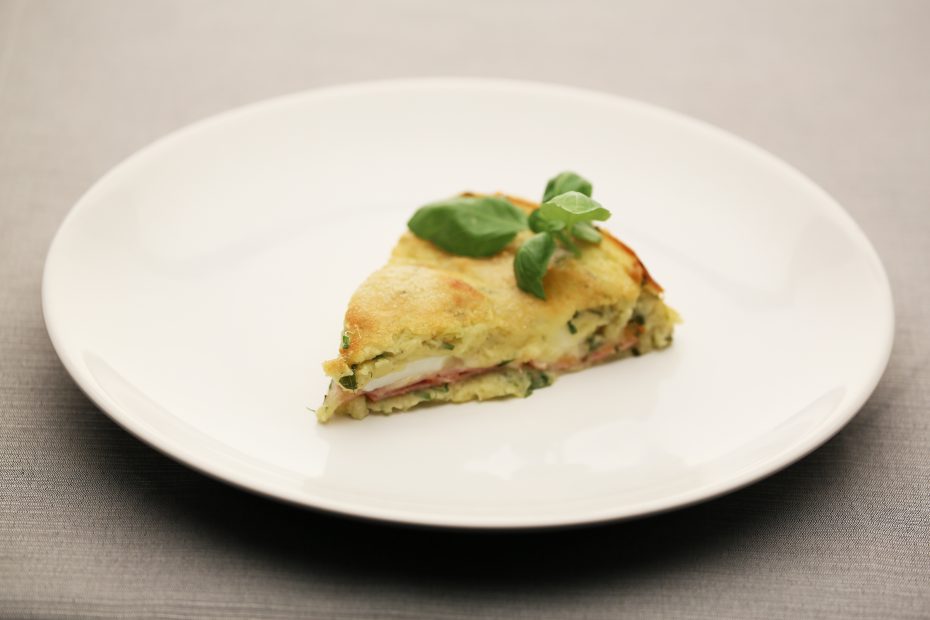 Vajjal kikenünk egy csatos tortaformát, rákenünk egy vékony réteg krumplipürét, rászórjuk a reszelt parmezánt, rárakjuk a vékony szeletekre vágott mozzarellát, a pármai sonkát, majd egy sor főtt tojáskarikát.