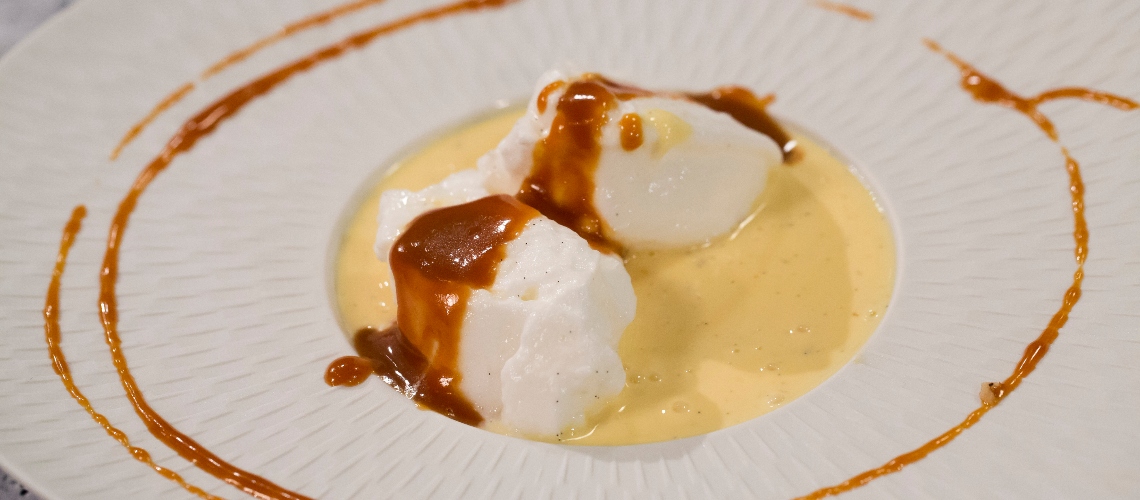 A tejszínes tejhez adjuk hozzá a vaníliarúd kikapart magjait, kezdjük el hevíteni, majd forraljuk fel, és kanállal szaggassuk bele a tojáshabból a formázott galuskákat. Két-három percig főzzük, majd óvatosan fordítsuk meg újabb két-három percre. Ezután már szedhetjük is ki egy üres tálba. A tejet ezután folyamatos keverés közben adjuk hozzá kis adagokban a sárgájához.