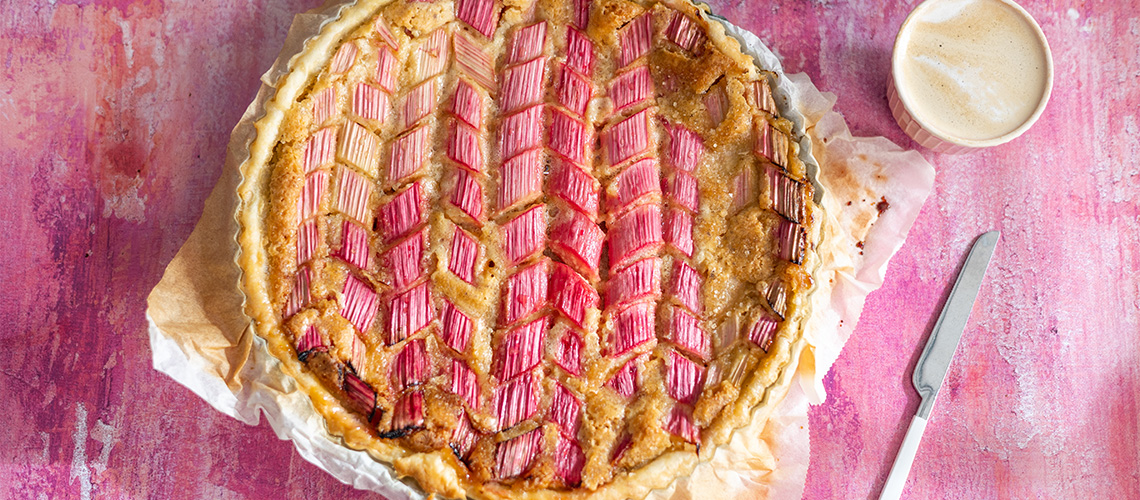 A tésztához a hozzávalókból gyors mozdulatokkal vagy robotgéppel ruganyos tésztát gyúrunk. Enyhén lisztezett deszkán kinyújtjuk, kerek piteformába terítjük, rákenjük a tölteléket, majd elrendezzük rajta a darabokra vágott rebarbarát Megszórjuk 2 evőkanál barna cukorral. 25–30 perc alatt készre sütjük. Akkor jó, ha a töltelék felemelkedik, a gyümölcs pedig megpuhul. Teljesen kihûtjük szeletelés elôtt.