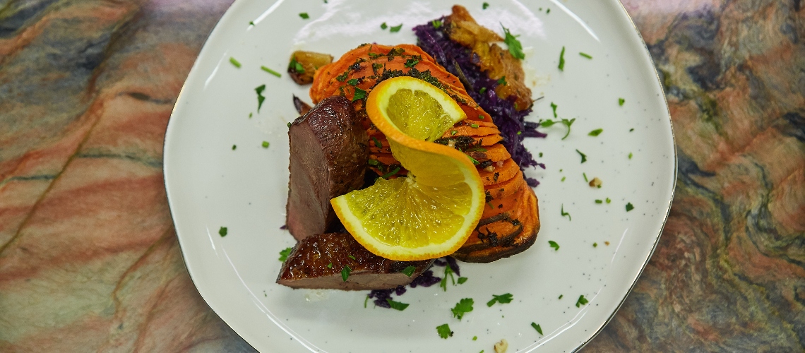 A kacsamellet beirdalom, sózom, borsozom, a bőrös felén forró serpenyőben elkezdem sütni (zsiradék nélkül) 1 szál rozmaring és 2 gerezd fokhagyma társaságában, majd fordítok rajta 6 perc után. További 5 percig sütöm a másik felét. Egy kisebb tepsiben helyezem, majd frissen vágott narancskarikával/filével, és a kacsából kiolvadt zsírral, plusz egy kis vajjal, narancslével, zúzott fokhagymával, kakukkfűvel a 180 fokos sütőbe helyezem és kb 45 perc alatt készre sütöm. Folyamatosan figyelem, nehogy túlmenjen, ügyelek rá, hogy omlós maradjon (amiatt lehet a hőfok 170 is, és a sütési idő picit több).