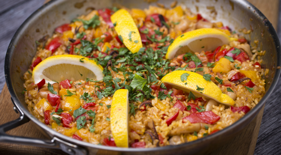 A paella főzéséhez egy magas falú serpenyő kell. Először olajon megpirítjuk az aprított hagymát, fokhagymát és a darabokra vágott sárga és piros húsú paprikát. Hozzáadjuk a tintahalat és pároljuk. Ezután rászórjuk a rizst, amivel szintén egy kicsit pároljuk. Felöntjük az alaplével, a borral és vízzel. Magas fokozaton főzzük 10 percig, majd hozzáadjuk a sáfrányt, és kis fokozaton 15 perc alatt puhára főzzük.